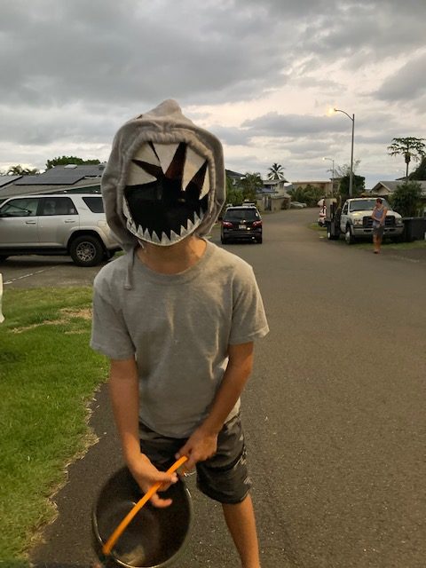 My son’s homemade shark costume for Halloween last year. I was really pleasantly surprised at how well my cheap clearance glue gun worked for gluing cardboard to the fabric. I used one of my black KN94 masks and painted white teeth on it for the bottom jaw. 🙂