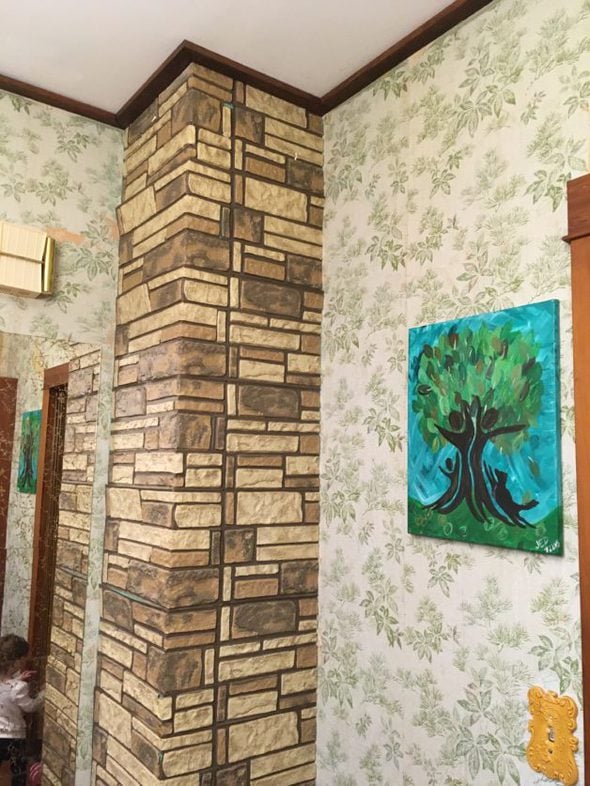 Our “chimney.” Those are plastic bricks. And the speckled stick-on mirrors are in 3 places in our house. That wallpaper? The stuff we ripped off was the exact same, only yellow.