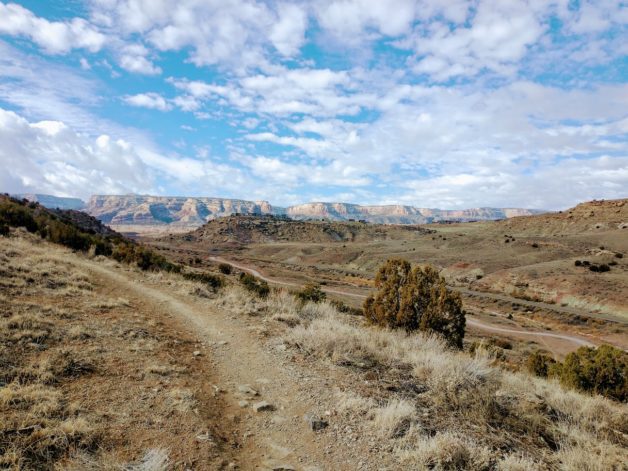 My partner biking on some of our favorite trails with the Grand Mesa and Mt. Garfield in the background