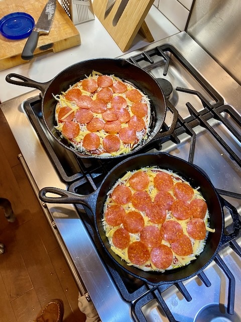 Friday night homemade pizza with our neighbors is one way we’ve modified plans with them to spend less money on going out! We each make two pan pizzas and bring our own beverages.