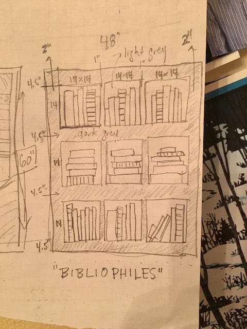 A drawing of my plan for a quilt for my mom, based on her love of reading and modeled after a modular bookshelf they have.