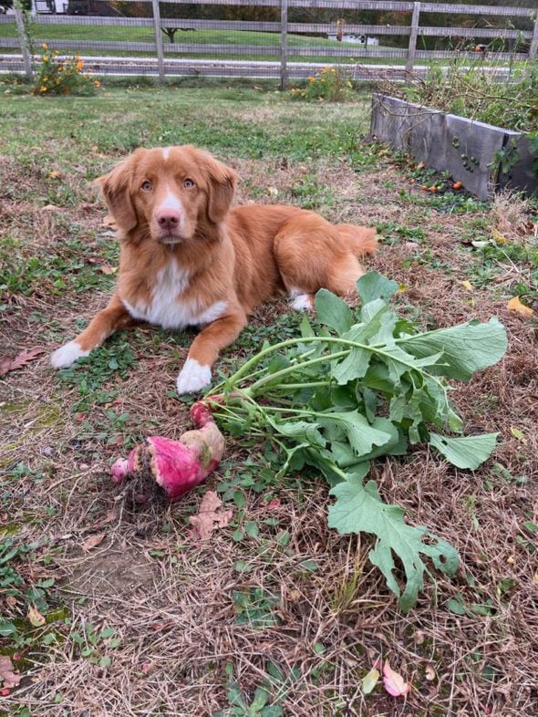 I forgot about a radish in the garden for approximately 4 months and nearly died laughing when I pulled it up yesterday. Puppy (Briar) for scale. I am so clearly a novice gardener!