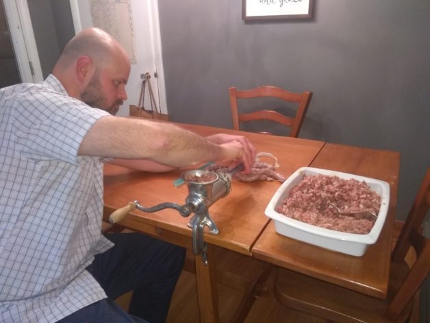 We made 400+ sausages, from good cuts of meat, and figured out that they were about 50c per sausage. This is cheap for us, and it was a lot of fun making the sausages together.