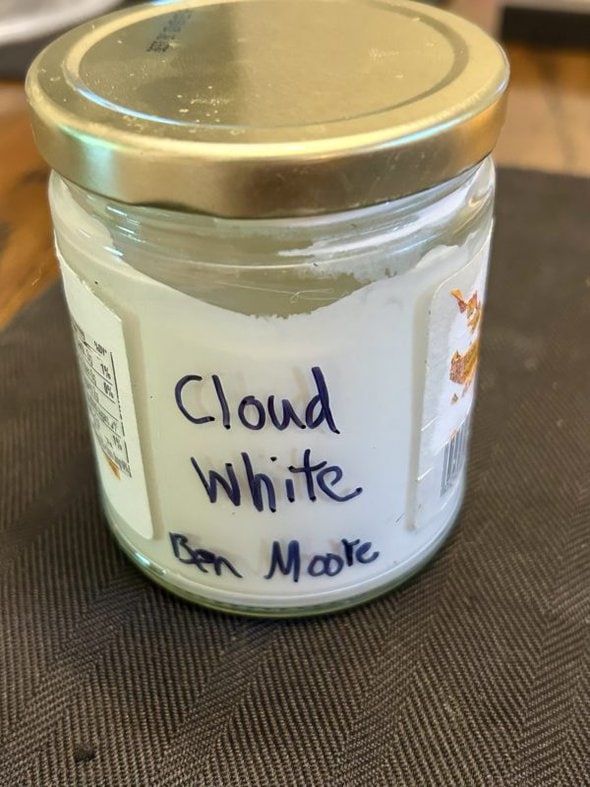 So when she was in town last week, I poured some of my Benjamin Moore Cloud White paint into a saved Trader Joe’s sun-dried tomato jar and sent it home with her so she can do some quick touch-ups.