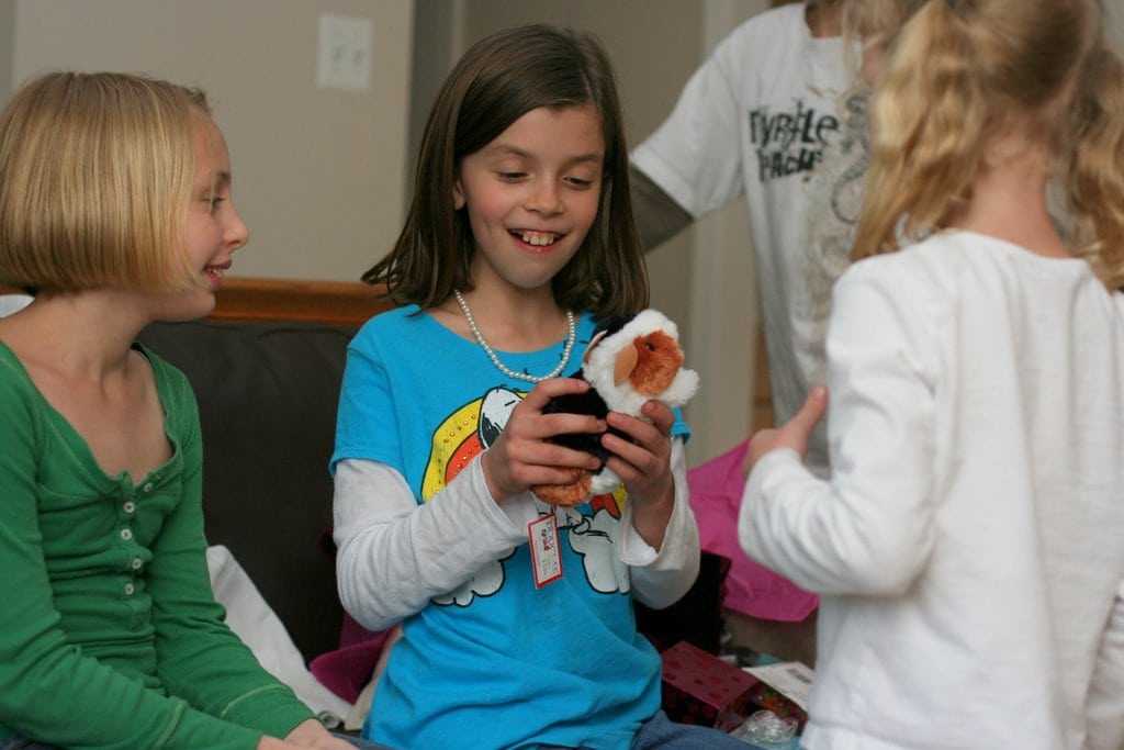 She didn’t mind the Christmas bag, though, because it contained the present she wanted most…a stuffed guinea pig from Joshua and Sonia (the pearls she’s wearing are from Zoe, who bought them for $1.20 at Goodwill).