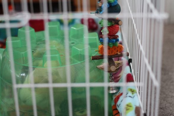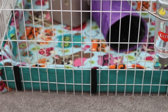 Due to the design of our cage, the girls do have to pin the fleece along the edges of the cage, or Leslie manages to burrow underneath the fleece. That’s a bit of a pain, but you wouldn’t necessarily need to do that with every kind of cage.
