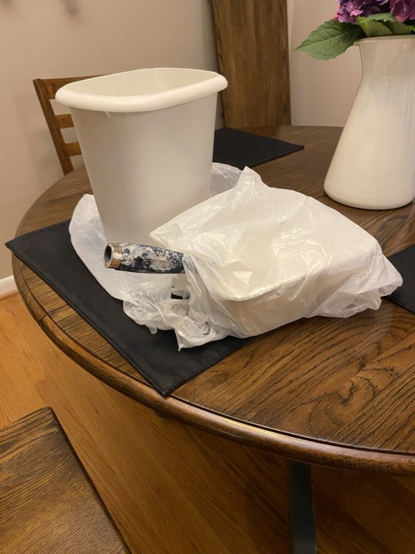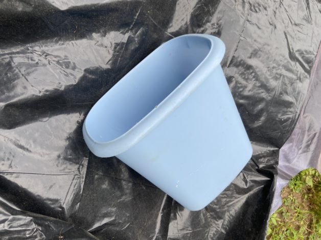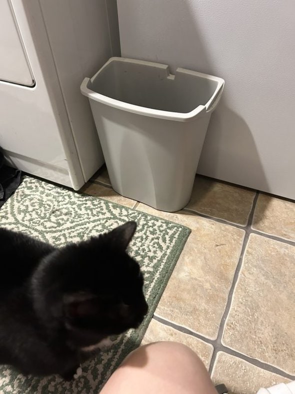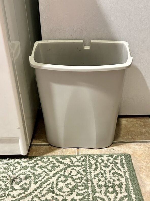 This one in my laundry room holds dryer lint; it’s a freebie from my Buy Nothing group, and it looks sort of like it was the bottom part of a paper shredder in a past life.