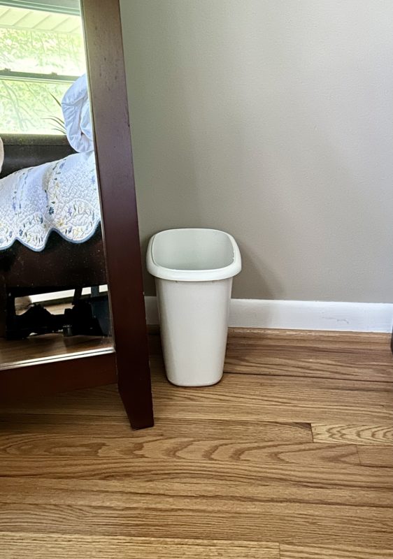 In my bedroom, I have another free trash can from my Buy Nothing group. Functional, but not a color I wanted.