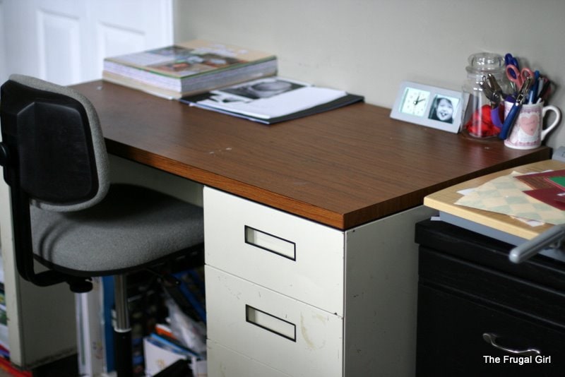 The top of that desk is formica, so I am loathe to mess with it. Besides, I sort of like having an old top that I can work on without worrying about messing it up. I think the top will be much less offensive looking once the sides and drawers are black, though.
