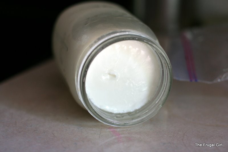 I always use whole milk to make my yogurt, and it turns out fairly thick. As you can see in the following picture, it’s stiff enough to stay in the jar when I tip it on its side.