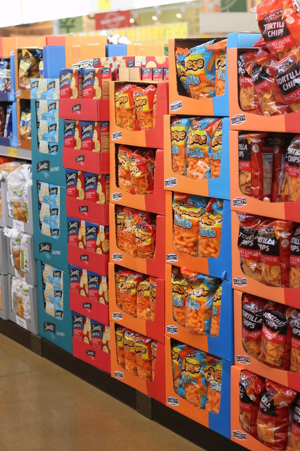 Aldi doesn’t remove its products from the cases they come in…instead, they just stack them up, right on the store shelving (which, by the way, is so durable that when they remodeled this store, all they had to do was put some fresh front pieces on the 18-year-old shelves. Yay for re-use!). The milk stays on the metal carts it comes in, as do the eggs.