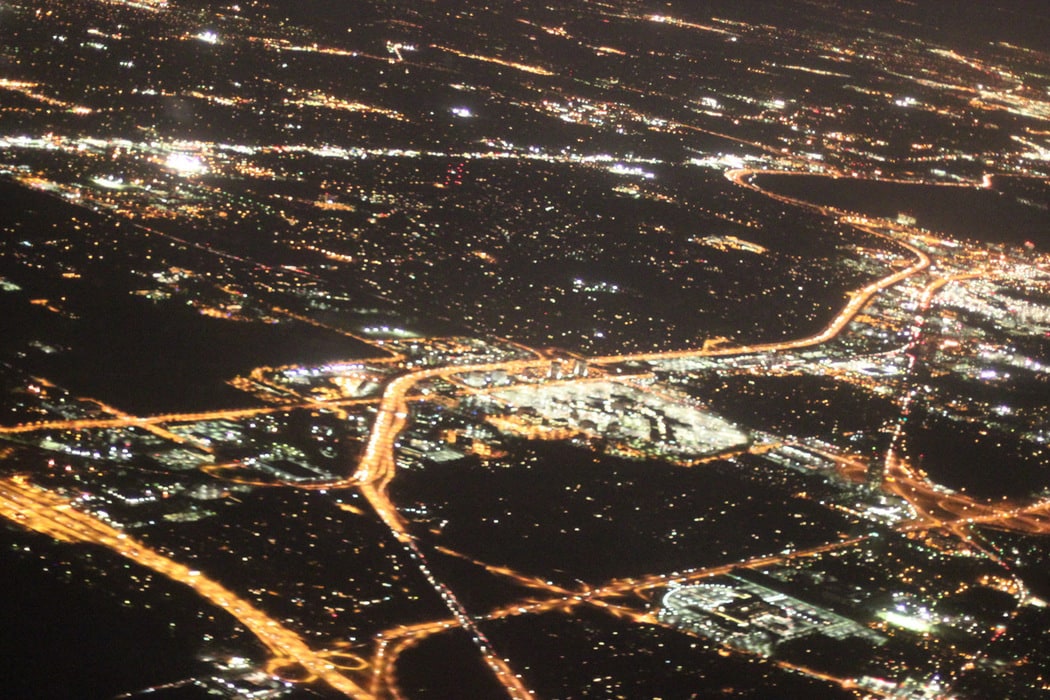 I haven’t flown for more than a decade, so I’d forgotten how beautiful cities are from the air at night. I tried to take pictures, but they’re all kind of blurry.