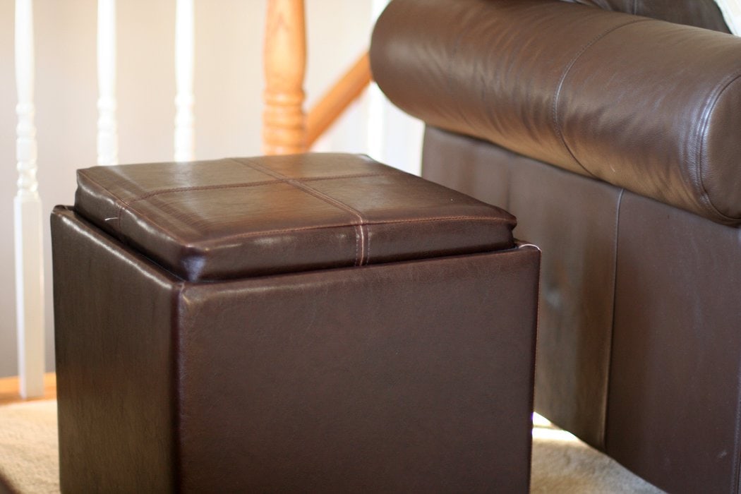The replacement is this little leather ottoman, which I got from Goodwill (of course). I see these every now and then at my Goodwill, but most of the time they are ripped or torn somewhere.