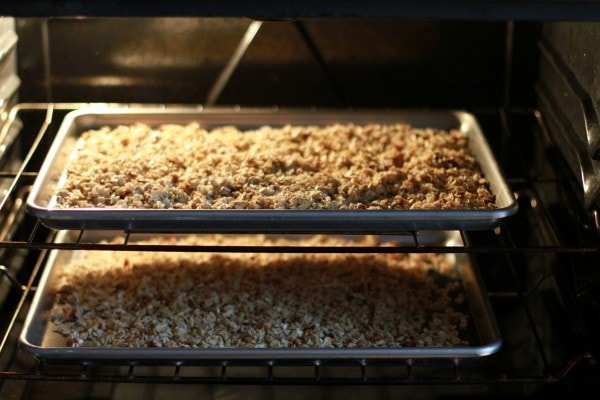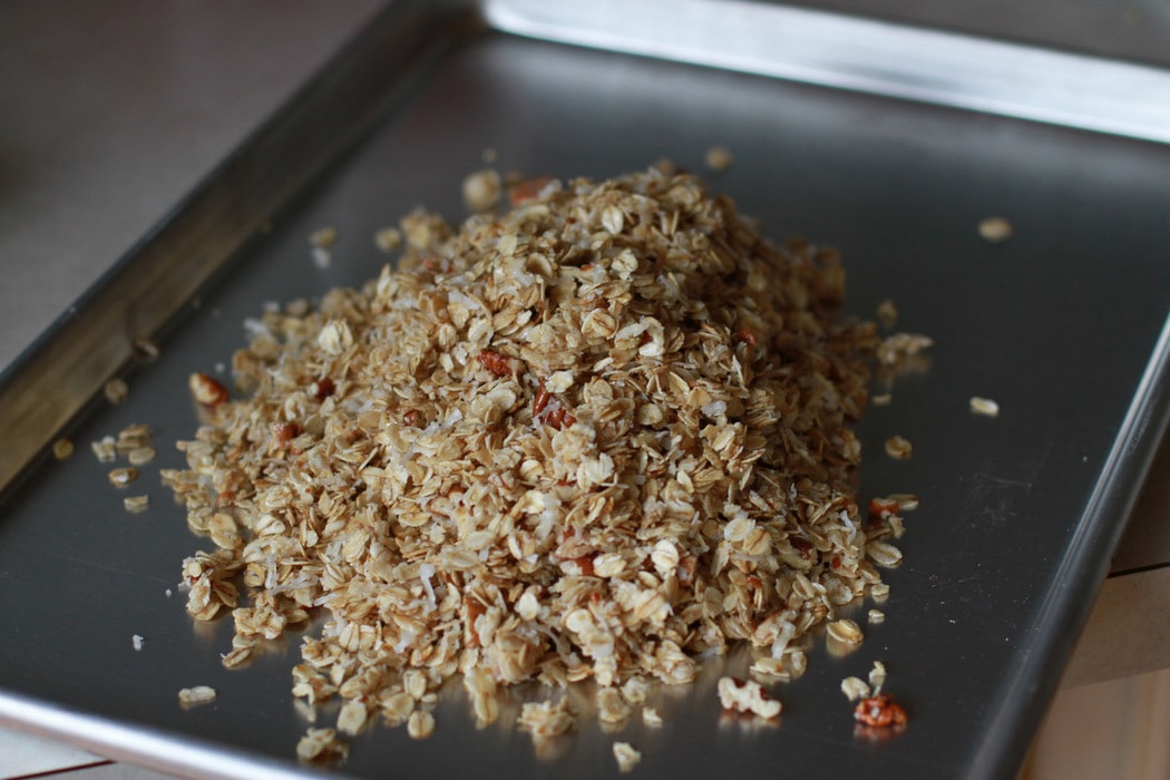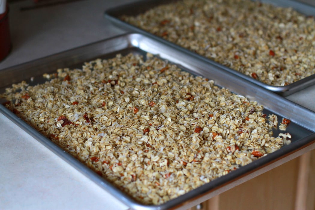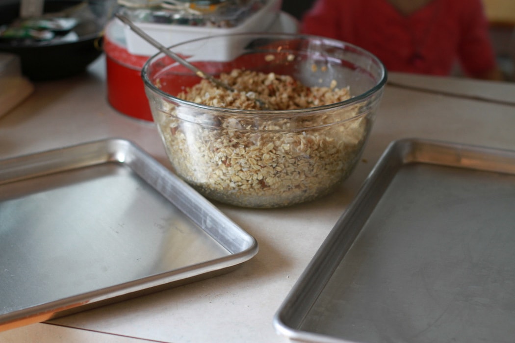 So, I was baking granola on my regular cookie sheets, which worked great except that no sides on the pans meant I had to be uber-careful when I was stirring the granola. That made granola-making much more of a production than it ought to have been.