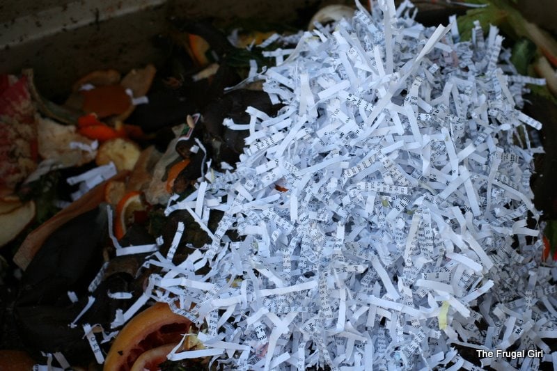 I can do you one better on the shredded paper use. . .use it as animal bedding. No one will ever want to steal your private information after your pet hamster pooped on it, and then, once soiled*, you can still add it to the compost bin. Really saves a lot of money if you have pets because the cost of litter and bedding adds up fast, but fortunately not as fast as the mountain of old bank statements and junk mail builds up. You can add a little baking soda to keep the odors down, and baking soda is perfectly safe for composting.
