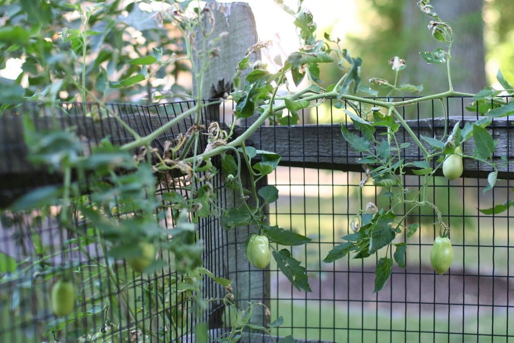 I will plant two tomatoes plants in the corner of my yard instead of just one, because I’ve discovered that the plant will grow up through the wire fencing, thus eliminating the need for tomato stakes.