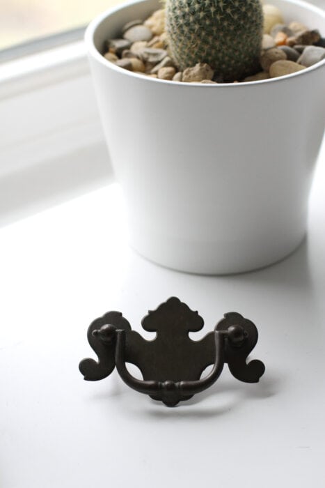Speaking of hardware…I had some pulls leftover from when I rehabbed Sonia’s Bassett dresser, and luckily, the drawer pull was precisely the right size for the existing drawer holes.