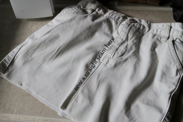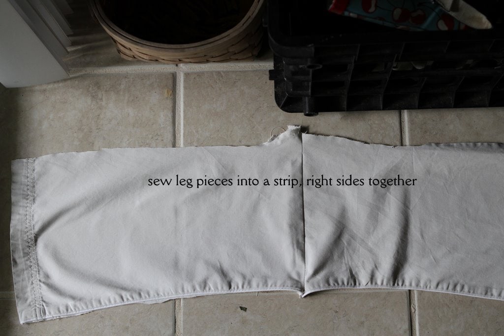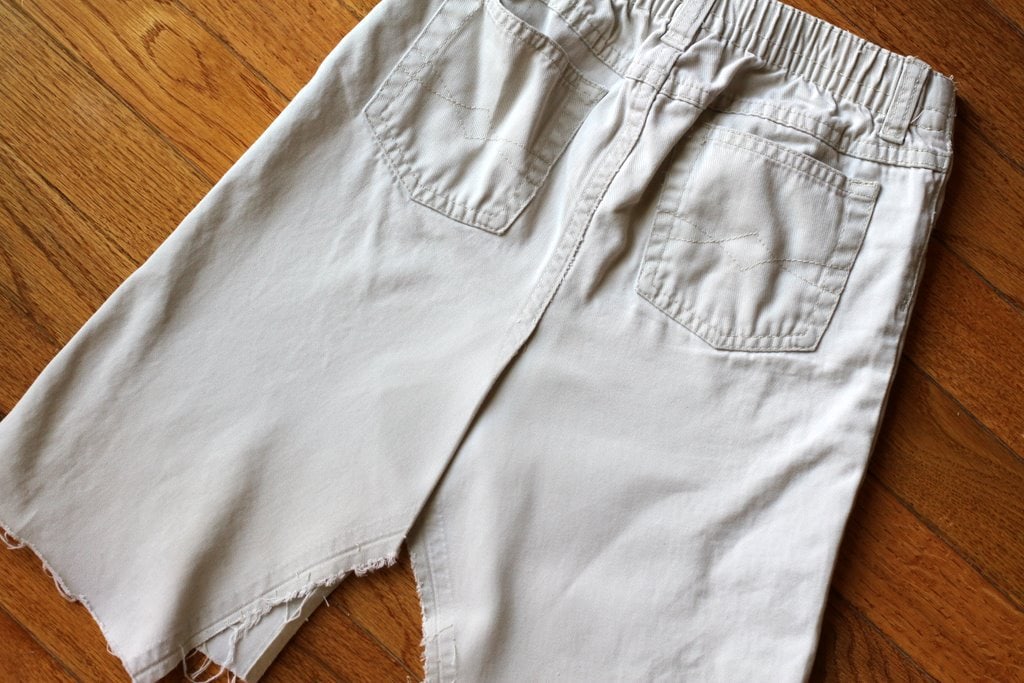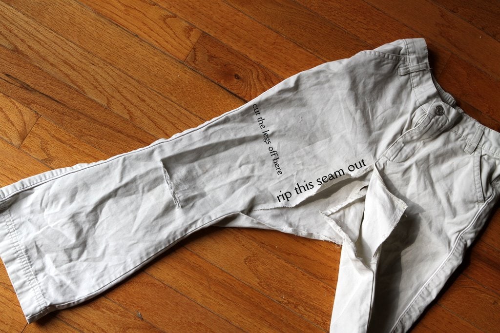Cut the legs off of the pants. Exactly where you cut them off is up to you. I usually cut them even with that piece of fabric that’s folded back in the above picture (I lay it down and then cut even with it).