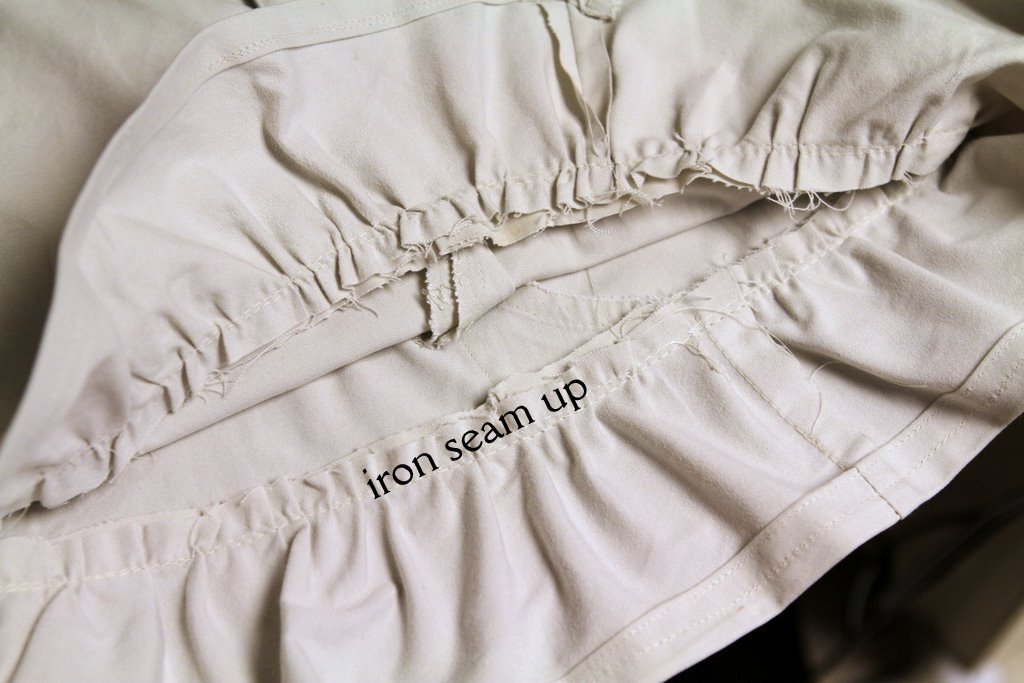 To help make the skirt look neat, iron the seam up, like so. Also, it’s a good idea to do a zig-zag stitch around the raw edges of the ruffle so that they’ll resist fraying.