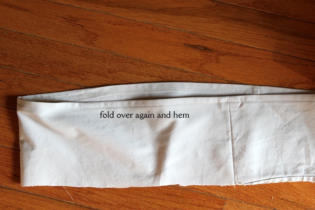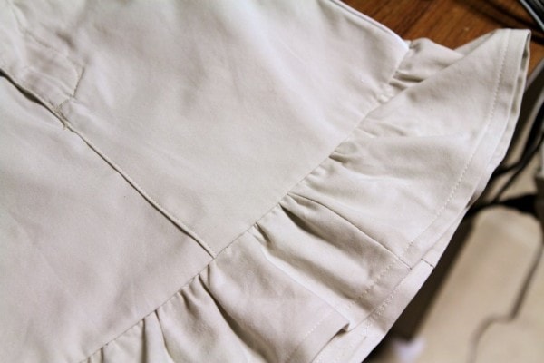 You’ll want to hem the ruffle before you gather it and attach it to the skirt (I tried hemming it afterwards the first time and would not recommend it!). First, iron the edge over about 1/4 inch, and sew along the edge.