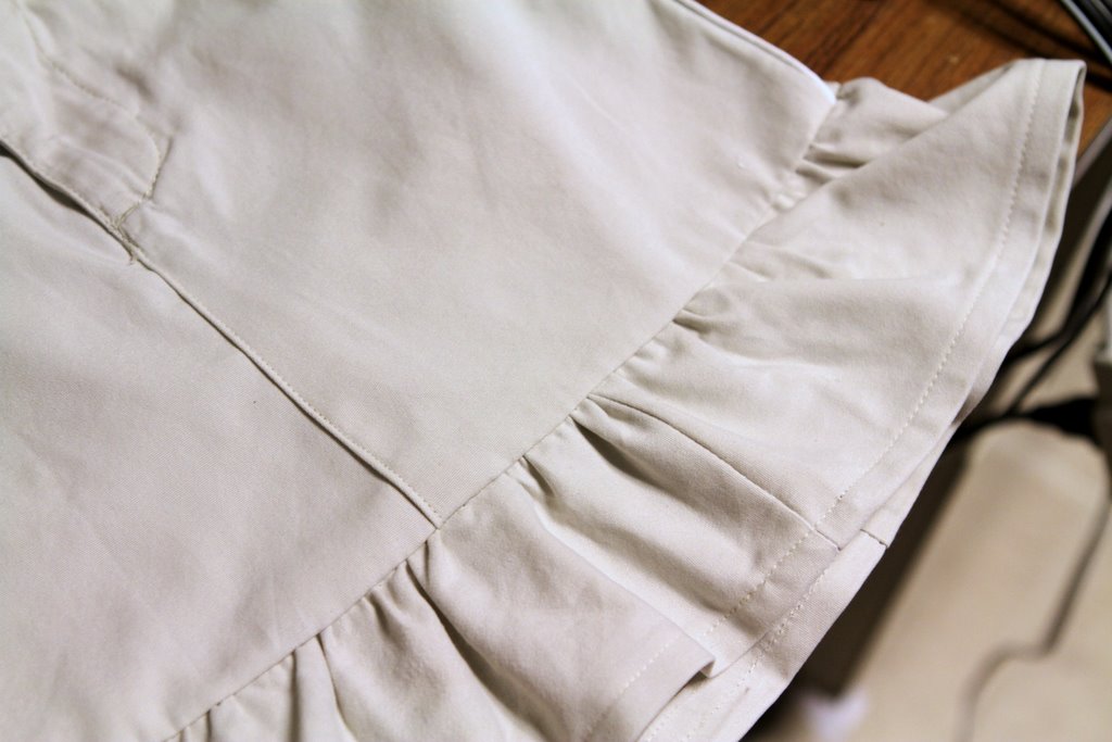 Fold and iron the sewn edge over again, and sew around the length. This is the hem of the ruffle, so you’ll want to decide what type of hem will look best…if the rest of the top-stitching on the skirt is double-stitched, then you’ll want to double-stitch the hem. In this case, the skirt was all single-stitched, so I did a simple hem about 5/8 inch from the edge.