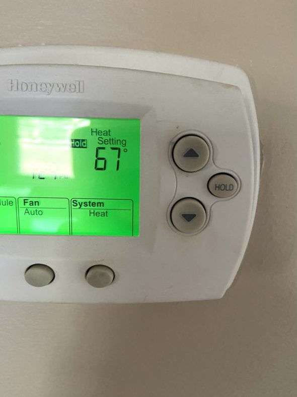 My heat is currently set at 67 degrees, which does feel a little on the chilly side to me.