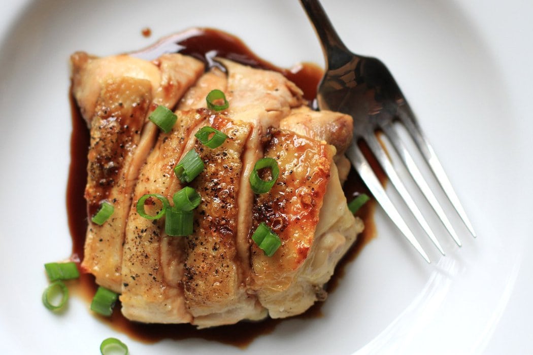 Once the chicken has rested, slice each thigh into strips, drizzle with teriyaki sauce, and sprinkle with chopped green onions.