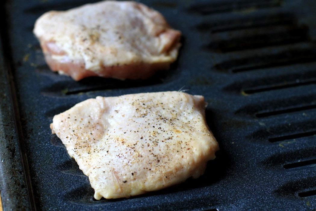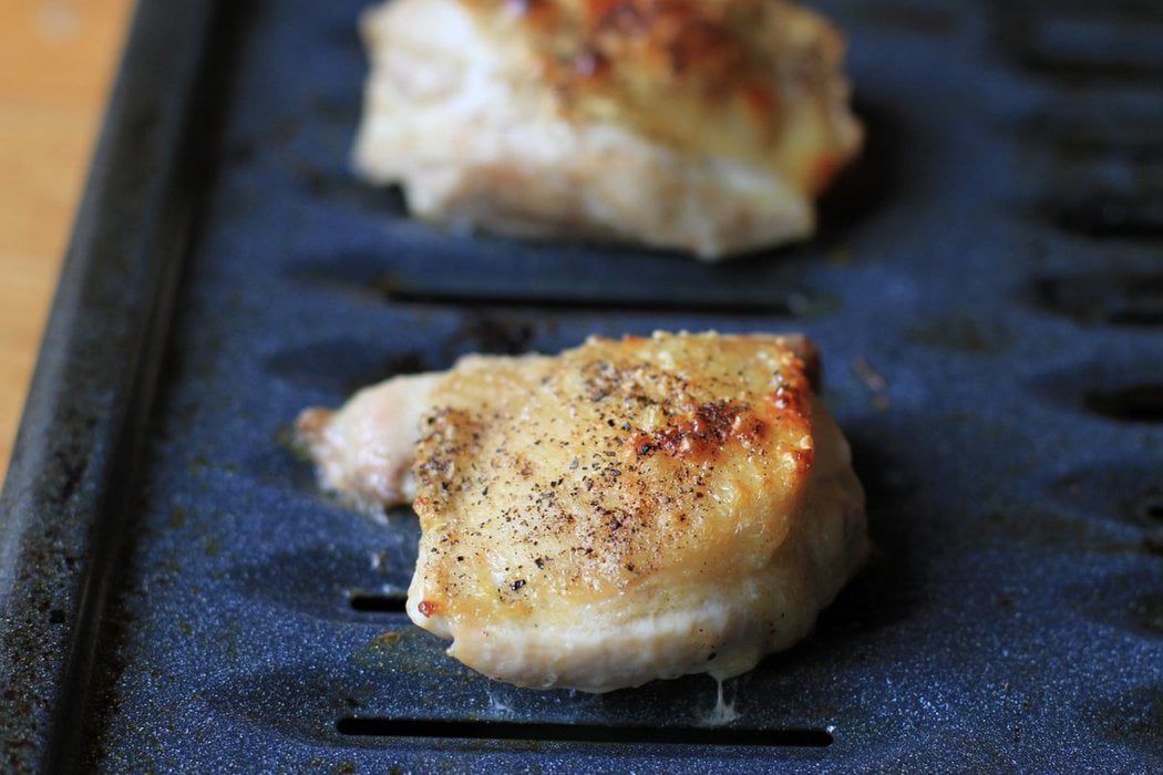 Season thighs with salt and pepper on both sides, then place on broiler pan, folding edges under to make a neat, even packet (They should be fairly thin.)