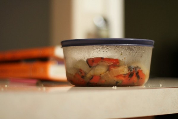 These are some grilled onions and peppers that lived in my fridge for too long, which is really quite sad because I do like them leftover. It was just a case of having too many good leftovers all at once, I guess.