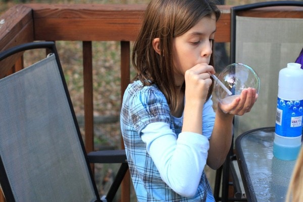 I’d say they’re maybe a little less stretchy and durable than commercial bubbles (the glycerin would fix that), but the girls had no trouble blowing bubbles with them, using a wand or a straw.