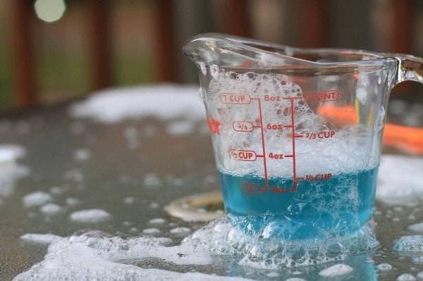 Fill the measuring cup with water first, and then gently add the dish soap, stirring gently so that you don’t make piles of suds.