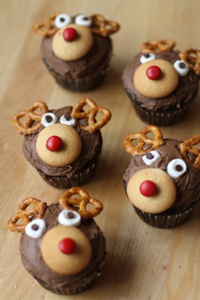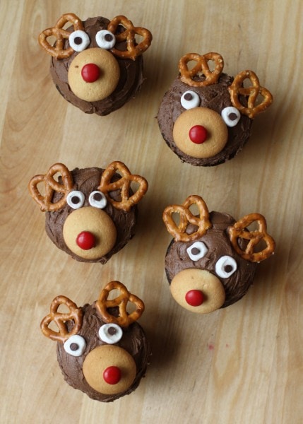 So, you’ll frost a cupcake with chocolate buttercream, add a Nilla wafer for a nose, and use a bit of frosting to secure an M&M to the wafer. We used red, but your reindeer can have brown noses too, of course. Then add mini pretzels for antlers.
