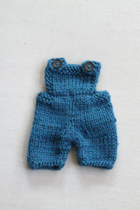 blue overalls; just like the pink ones on the bunny above. buttons are functional.