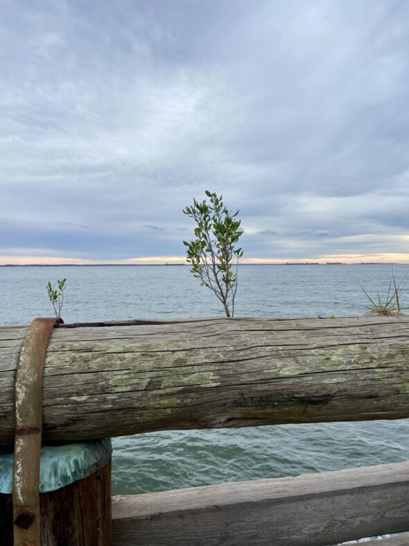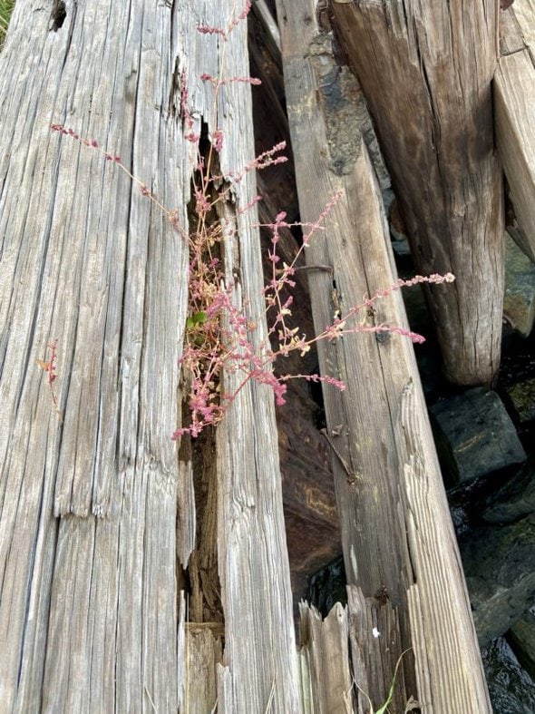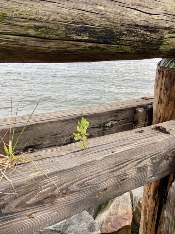 Often when I go for walks, I see plants or trees that are growing despite improbable odds. For instance, on my water-side trail, there’s a sorta dilapidated railing that has all sorts of little plants and grasses that grow out of it.