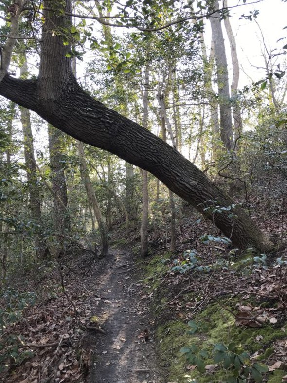 I also sometimes see trees that have nearly fallen, then adjusted and grown upward anyway.