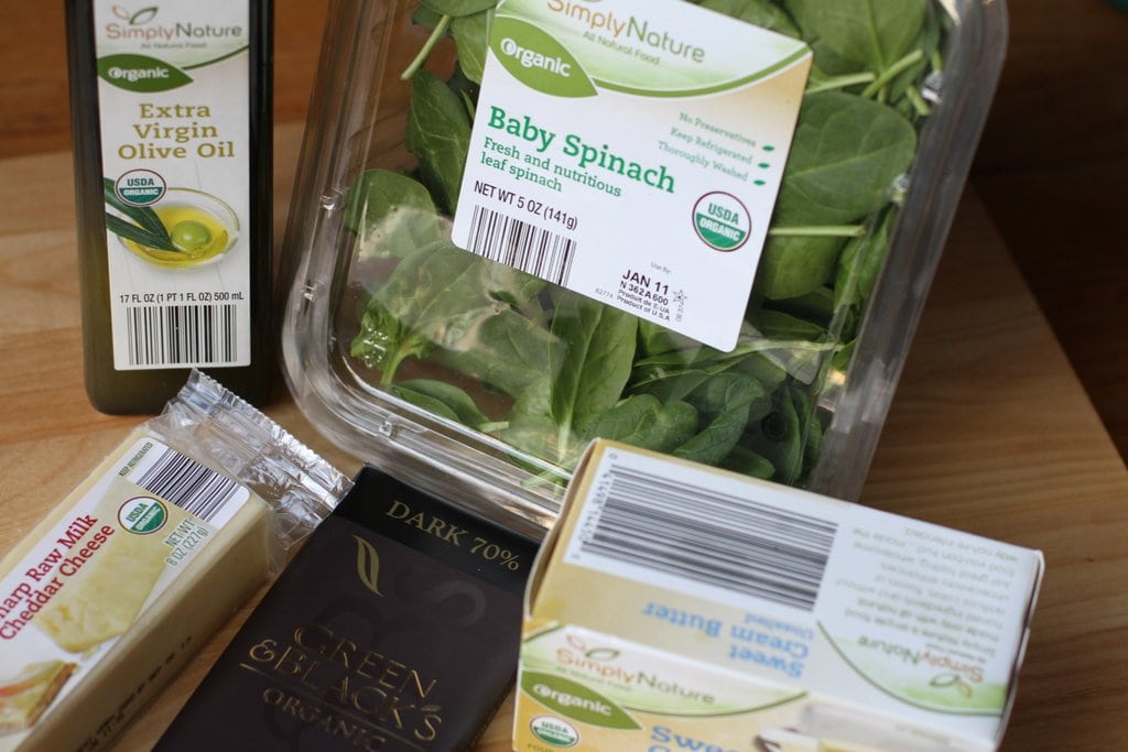 Organic olive oil, organic spinach, organic tomato sauce, organic butter, organic shredded wheat…all at great Aldi prices.