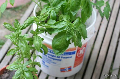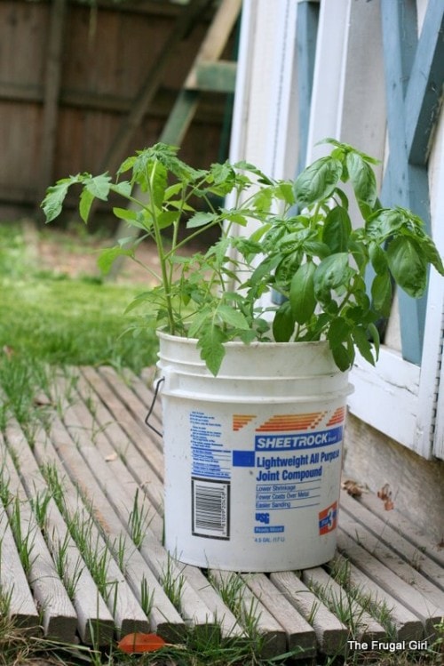Incidentally, do you not just adore my beautiful pot? 😉 I was out of real pots and didn’t want to fork over $20 for a large plastic pot. Since we’ve done so much remodeling we have spackle buckets aplenty, and though it’s ugly as sin, it was free and it works just fine.