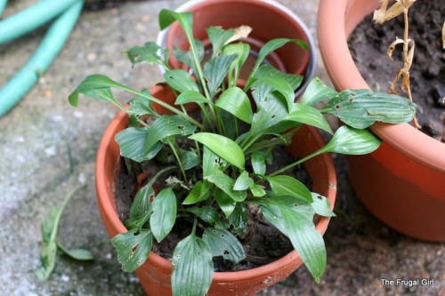 This poor little neglected hosta, which was in some really bad dirt in my yard, is now living in this pot with a compost/dirt mixture. Hopefully it will recuperate.