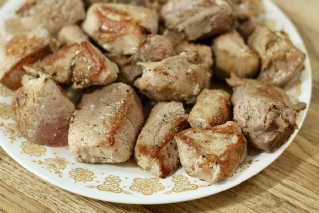 - 1 (2-pound) boneless pork butt roast, pulled apart at seams, trimmed, and cut into 1-inch pieces