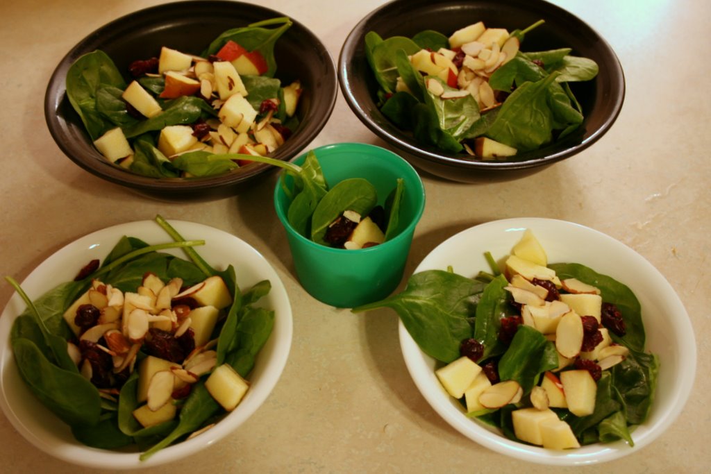 If you’re going to do it my way, just put spinach in each of the bowls and top it with the almonds, cranberries, and chopped apple. Then just pass the dressing at the table.
