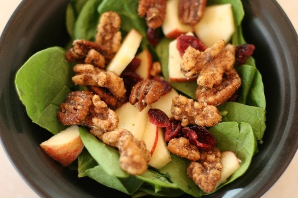 Or, if you’re making one big salad, just put the spinach into a large salad bowl, toss it with the cranberries, nuts, and chopped apple and add the dressing of your choice.