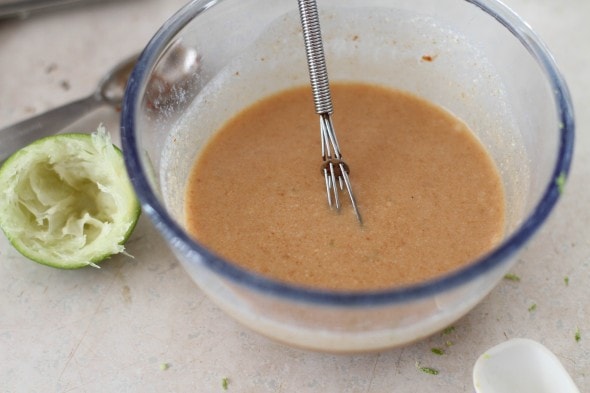 First up, you mix fish sauce, lime zest and juice, sugar, and red pepper in a bowl until the sugar is dissolved. Add coconut milk and curry paste, and the sauce is done.