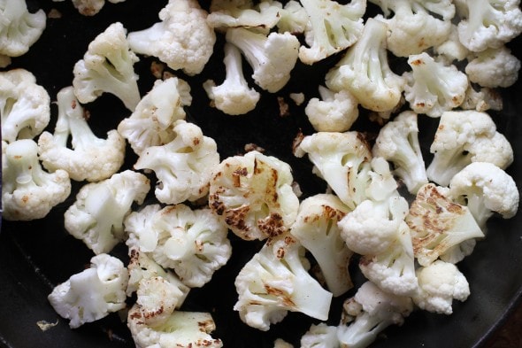 Add the cauliflower to the hot pan, and cook the florets for about 3 minutes, or until they’re barely tender. The original recipe says to stir every 10-15 seconds, but I let mine sit still more than that, so they get nice and browned.