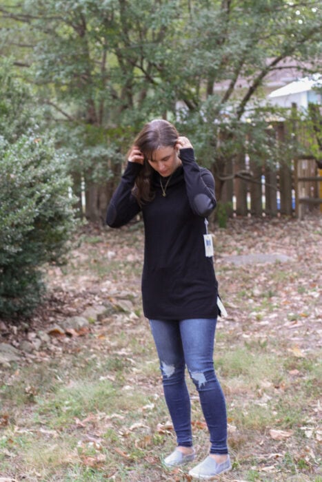This is a really warm sweater; so warm that I was feeling super overheated while we took these photos.