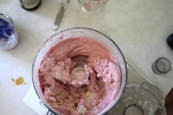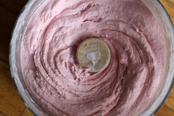 At first, it’s tempting to pour in tons of cream to help the fruit process better, but if you add too much, your finished product will be soupy. I usually use between 1/2 and 3/4 cup of heavy cream.