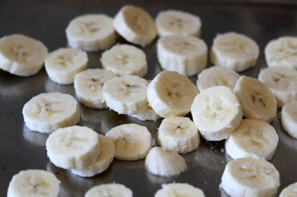 I spray a baking sheet with nonstick spray, slice the bananas, and freeze them right on the sheet.