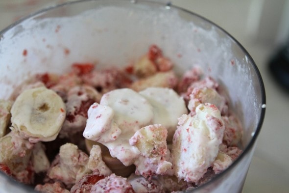 I make mine with just frozen bananas and strawberries, and it turns out perfect! (So no worries to dairy free friends out there :) )