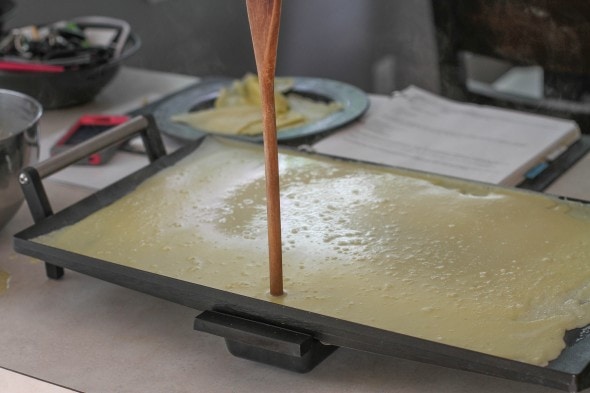You could make these in a round frying pan just like you would crepes, but I do it the easy way my mom did, on a big griddle.