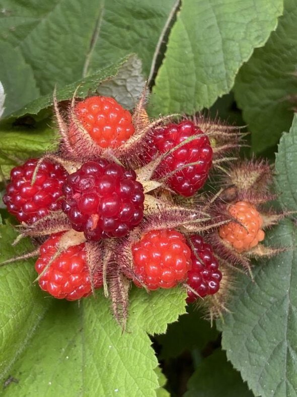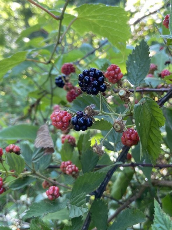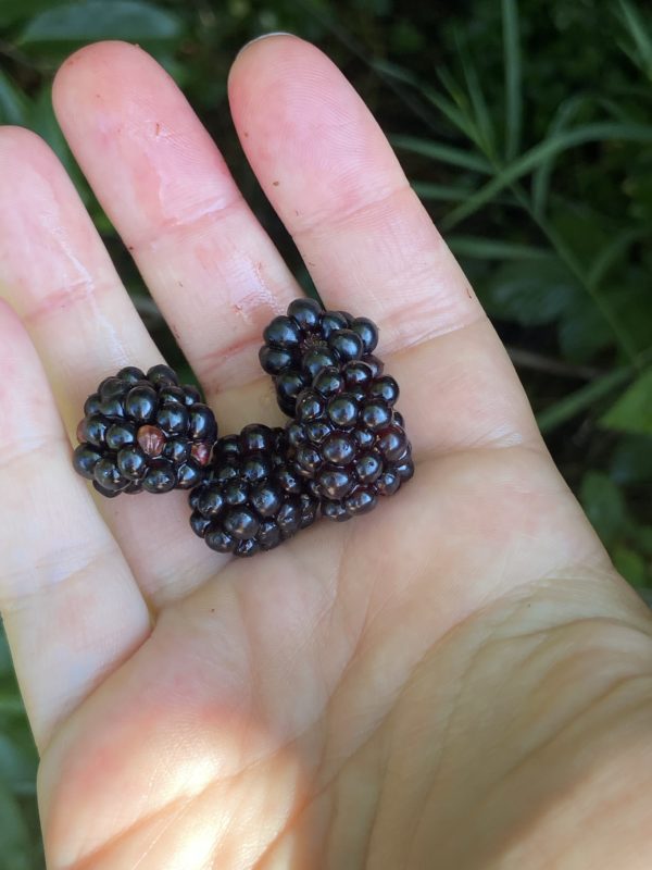 Right now, there are ripe blackberries, dewberries (which look a lot like blackberries), and wineberries out there for the picking.