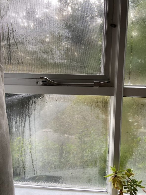 My front windows the other morning, when it hadn’t rained at all. That’s all just condensation from the humid air.